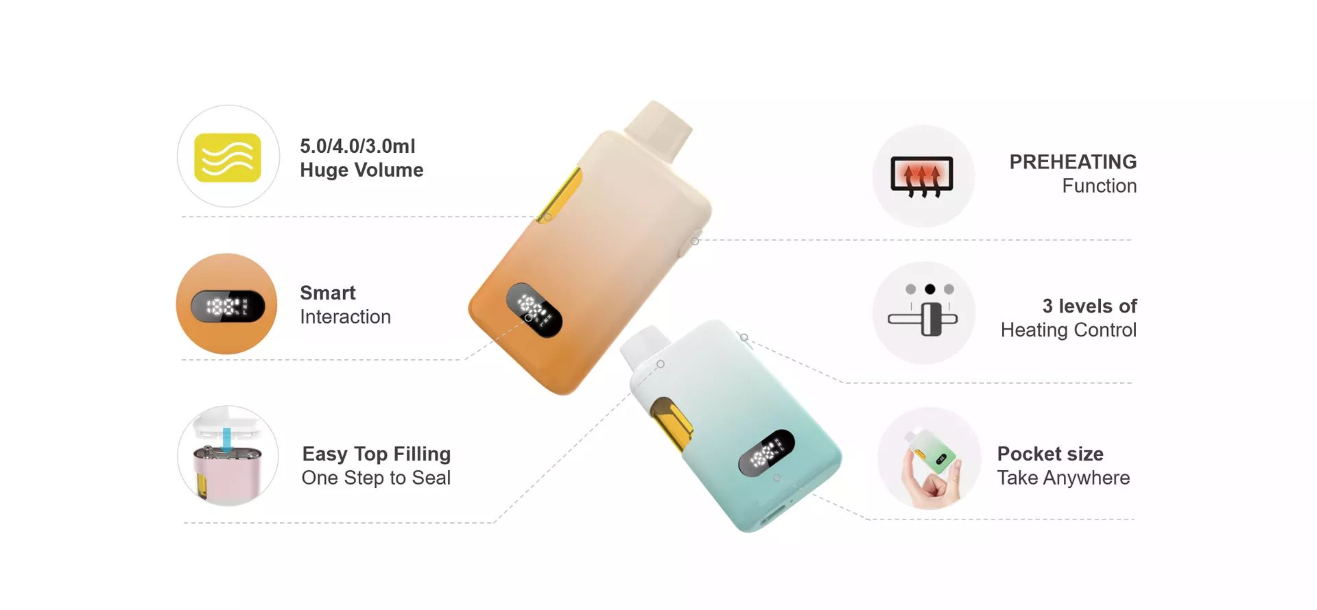 - V-shape form of oil cup to vape oil efficiently until the last drop.